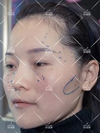 注射之前淚溝明顯,額角凹陷、太陽(yáng)穴凹陷、臉頰凹陷,右圖畫(huà)出需要治療部位。