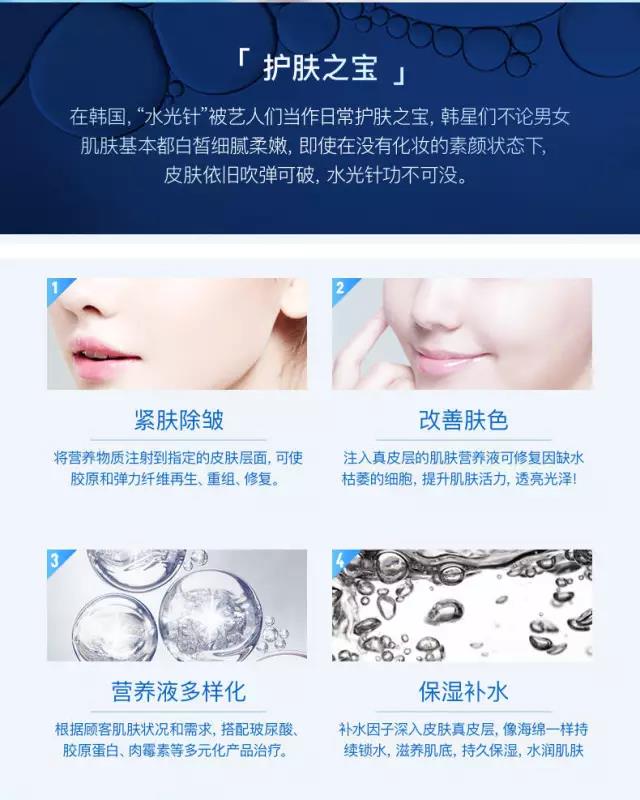產(chǎn)品的水光注射不是單針注射治療,而是通過水光注射設(shè)備給皮膚仿真層輸入透明質(zhì)酸。