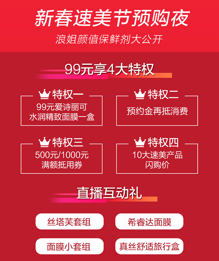 還有一份福利預(yù)告重磅來襲:新春速美節(jié)預(yù)購(gòu)夜,告訴你浪姐的保鮮秘笈1月29日19:30,99元預(yù)約金暢享4大特權(quán):99元愛詩(shī)麗可水潤(rùn)精致面膜一盒;預(yù)約金直接抵扣;1000元/500元現(xiàn)金抵用券;10大速美產(chǎn)品閃購(gòu)價(jià),直播還有超多互動(dòng)福利等著你來拿!