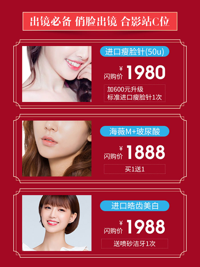 【進(jìn)口瘦臉】拒絕照騙,小臉稱霸;【海薇M+玻尿酸】助你逃離時(shí)間魔掌;【進(jìn)口皓齒美白】給牙齒一次表“白”的機(jī)會(huì)。2021,俏麗出鏡,合影站C位!